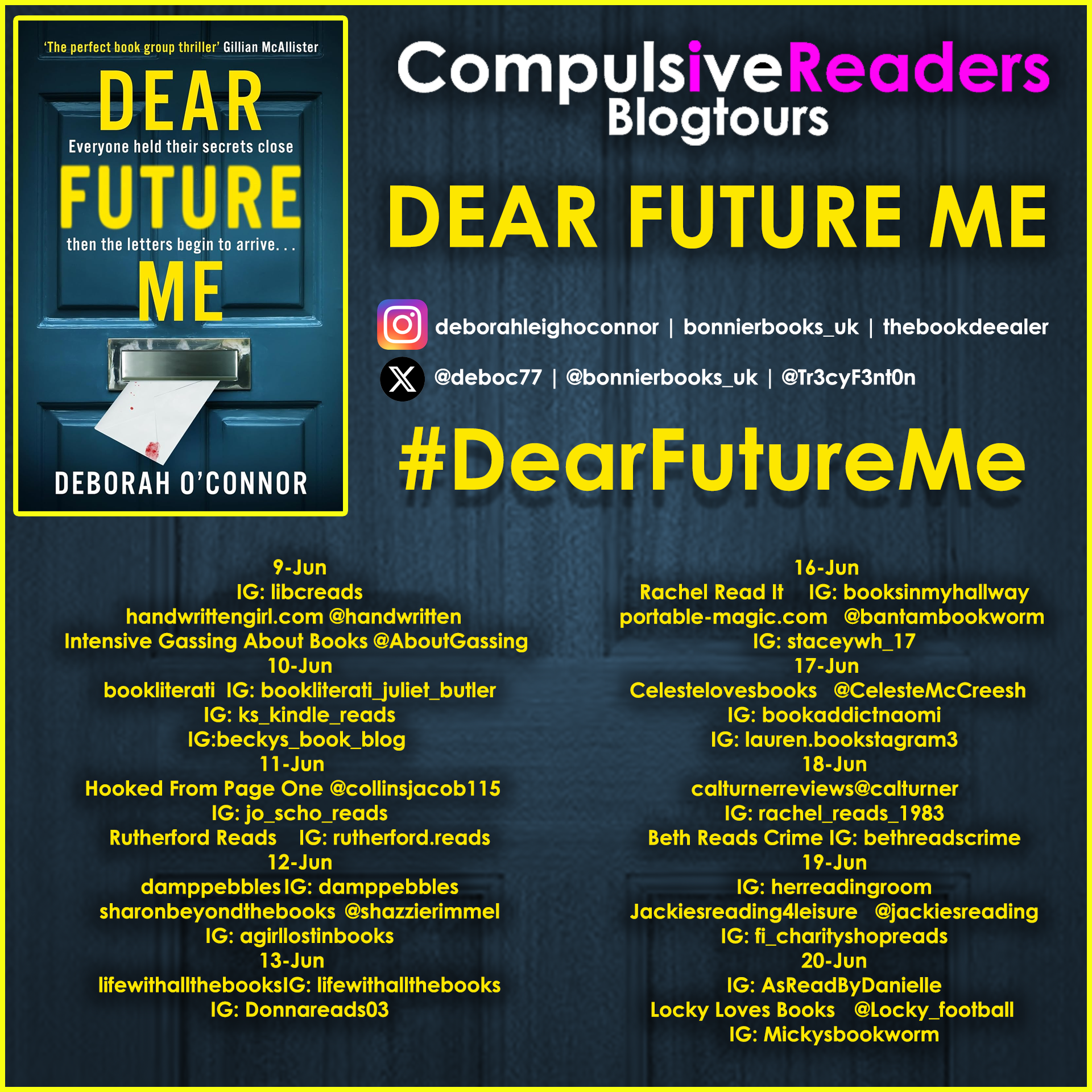 Hello and welcome to damppebbles. Today I am delighted to share my review of Dear Future Me by Deborah O’Connor. Dear Future Me is published by Bonnier Books today (that’s Thursday 12th June 2025) and is available in paperback, audio and digital formats. I chose to read a free eARC of Dear Future Me but that has in no way influenced my review. My grateful thanks to Tracy at Compulsive Readers Blog Tours for inviting me to join the tour and for sending me a digital copy of the book.